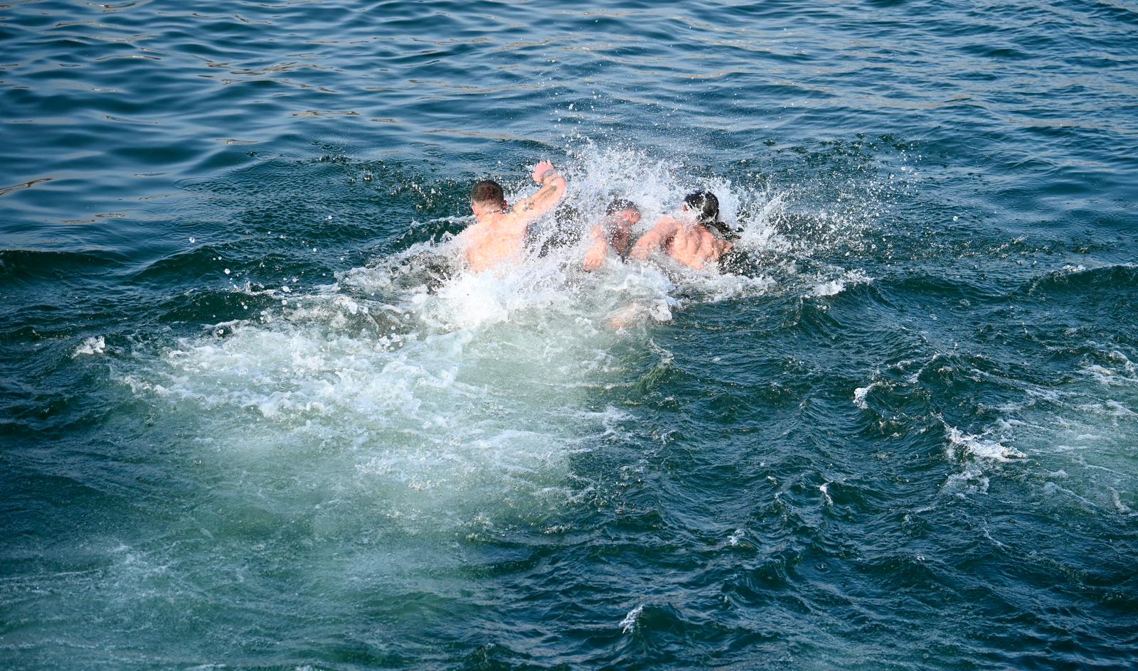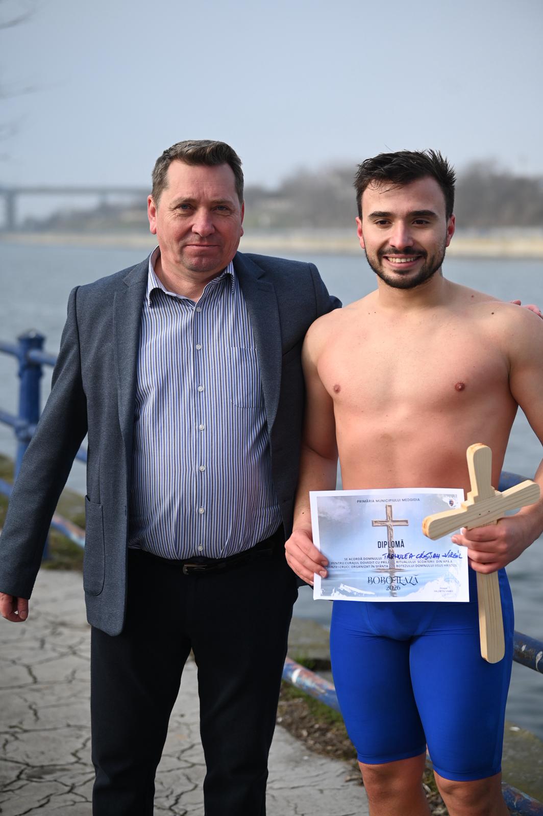 Încurajați și de vremea frumoasă, patru tineri curajoși s-au înscris în competiția pentru recuperarea Crucii aruncată în apă iar cel mai rapid înotător a intrat în posesia ei. Acesta a fost Tranulea Cristian-Virgil în vârstă de 26 de ani, campion mondial la înot în ape înghețate, care a fost câștigătorul premiului și în urmă cu doi ani.