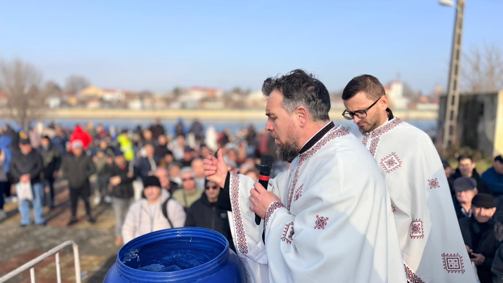 Cu acest prilej, sute de persoane au fost prezente la slujba săvârșită de un sobor de preoți, în apropierea Canalului Dunăre-Marea Neagră.