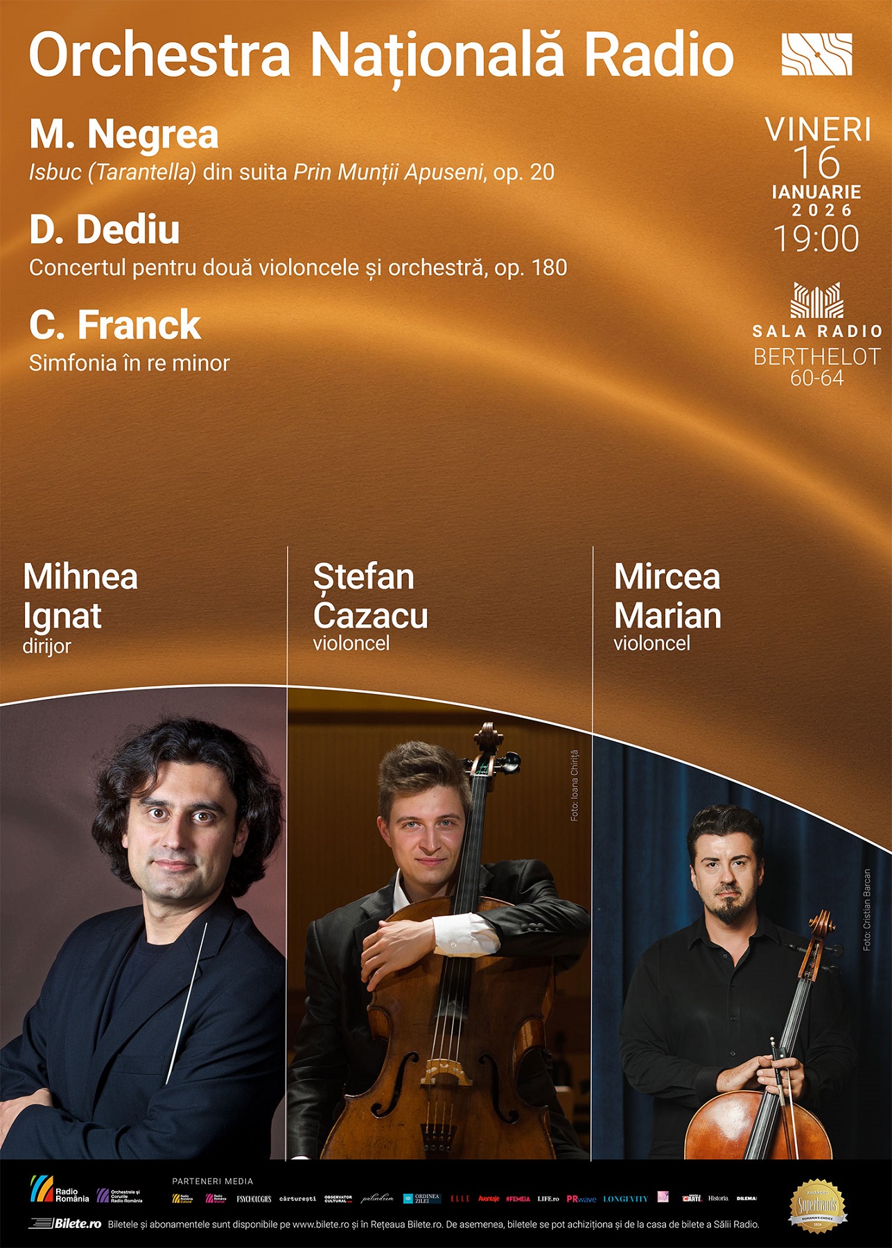 • Ziua Culturii Naționale este celebrată la Sala Radio prin concertul programat vineri, 16 ianuarie (de la ora 19:00), eveniment prezentat de Orchestra Națională Radio. Veți asculta în programul serii două lucrări semnate de compozitori români: Marțian Negrea – Isbuc (Tarantella) din suita Prin Munții Apuseni și Dan Dediu: Concert pentru două violoncele și orchestră. Seara de la Sala Radio se va încheia cu Simfonia în re minor compusă de César Franck.